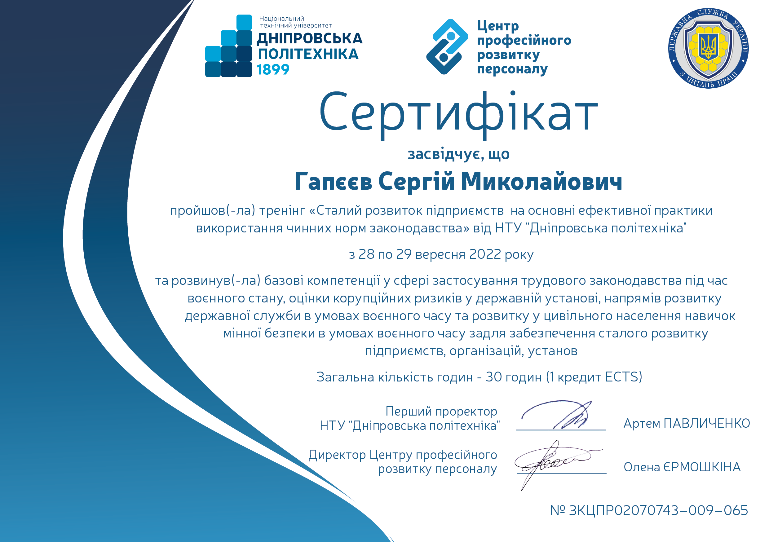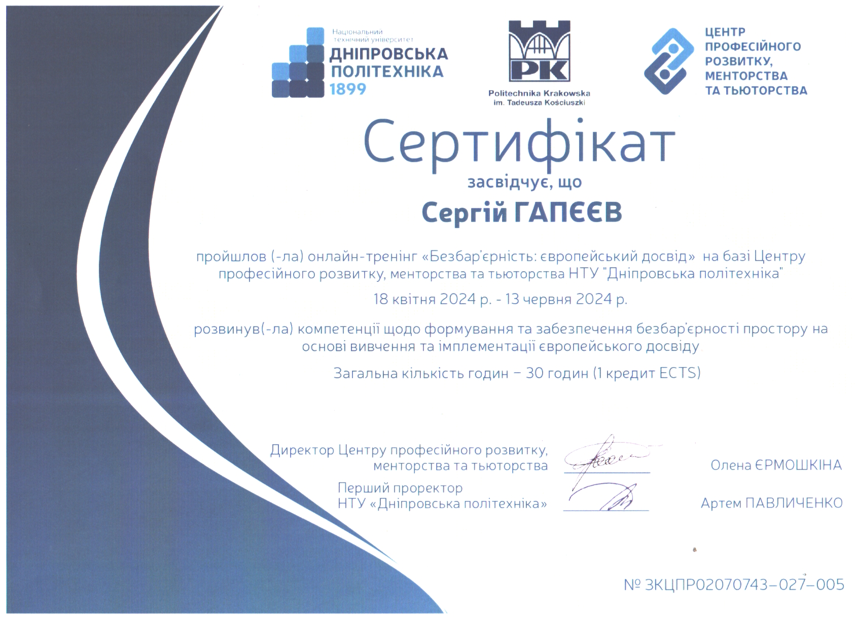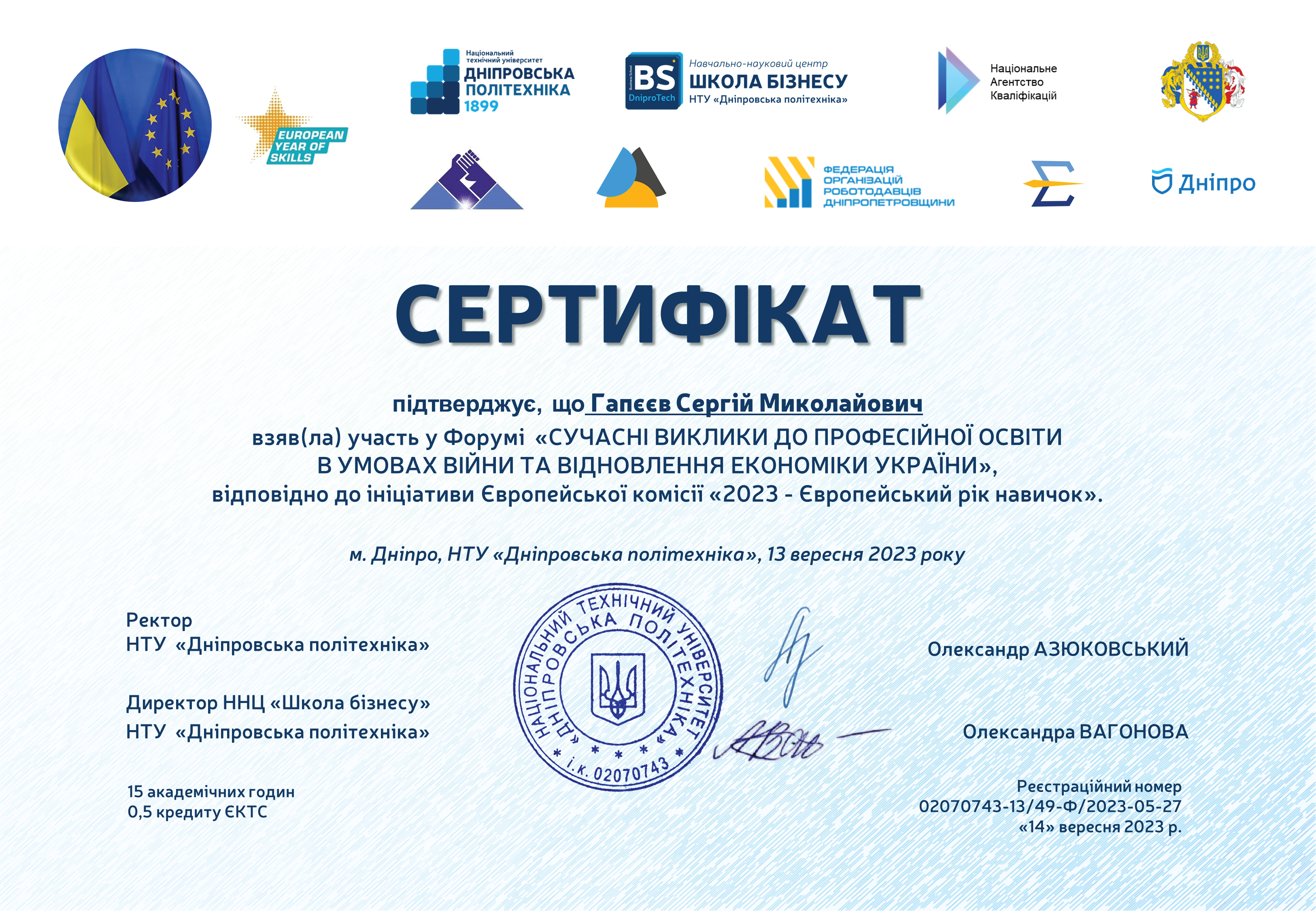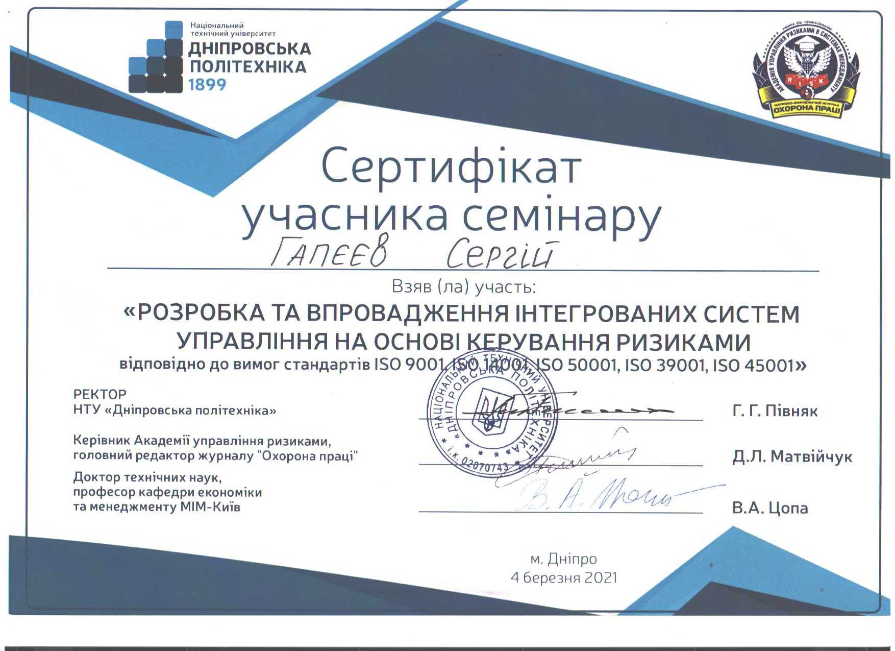 У 1997 році з відзнакою закінчив Національну гірничу академію України за фахом "Шахтне і підземне будівництво".