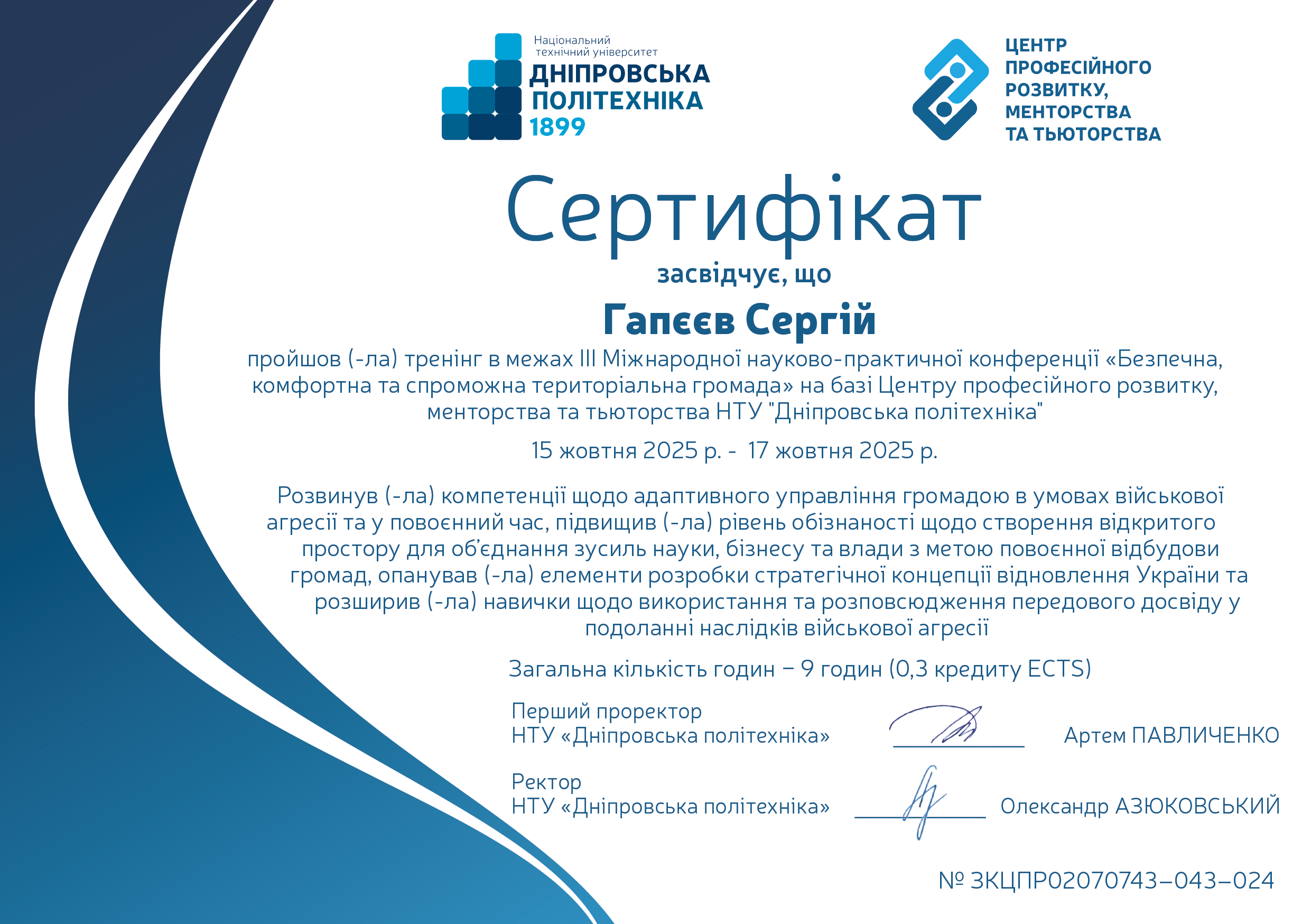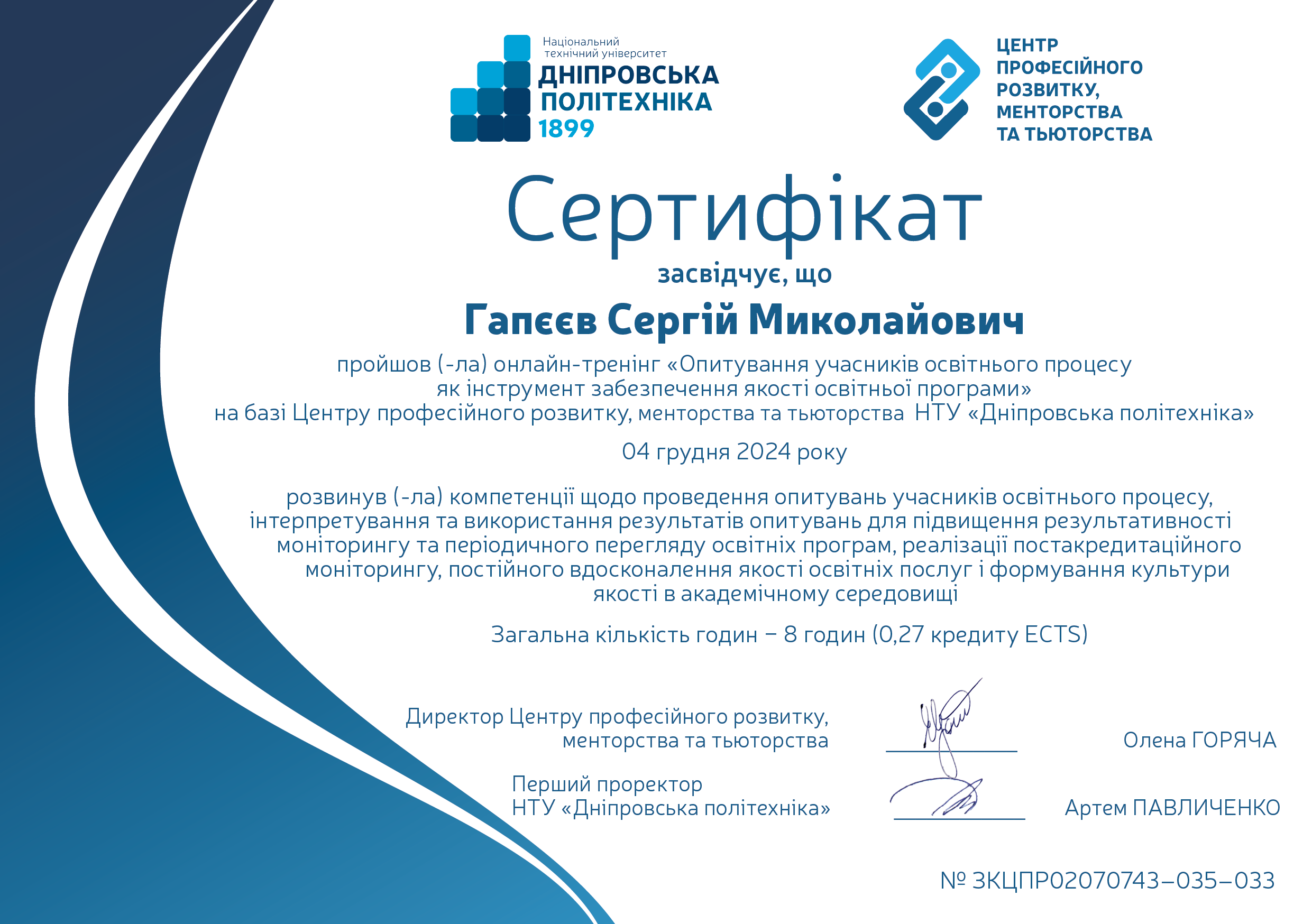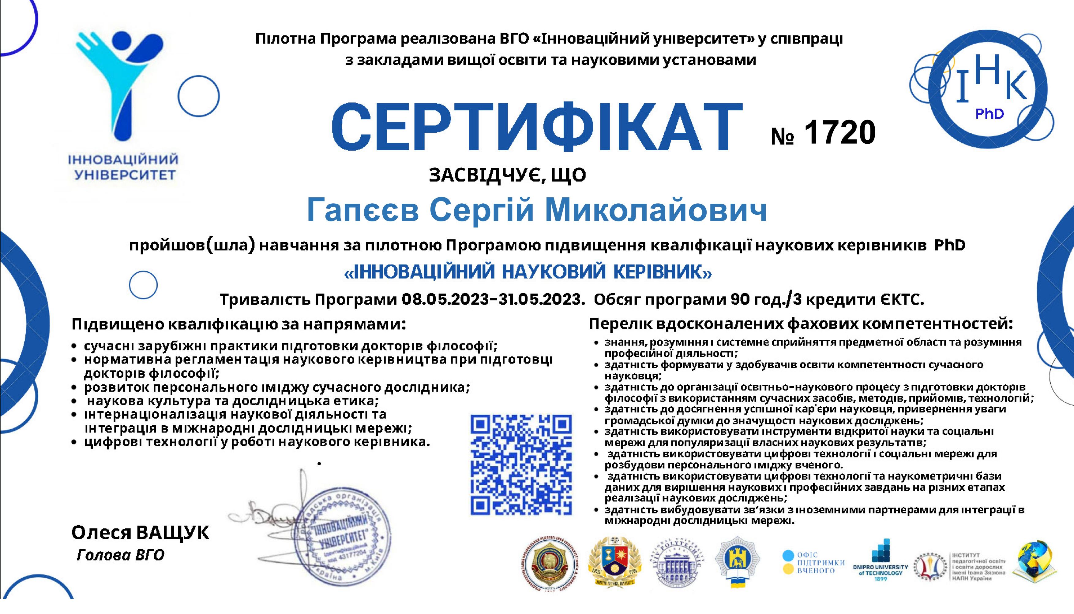 В грудні 2015 року захістив докторську дисертацію за спеціальністю 05.15.09 - Геотехнічна і гірнича механіка. Науковий консультант - професор О.М. Шашенко.