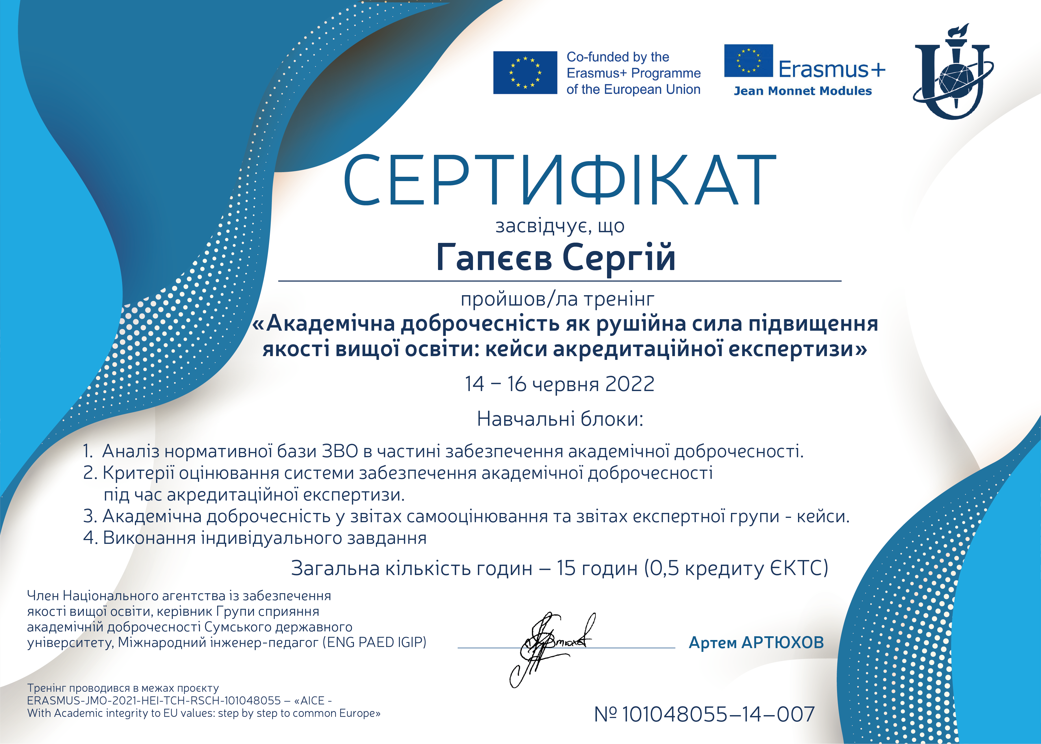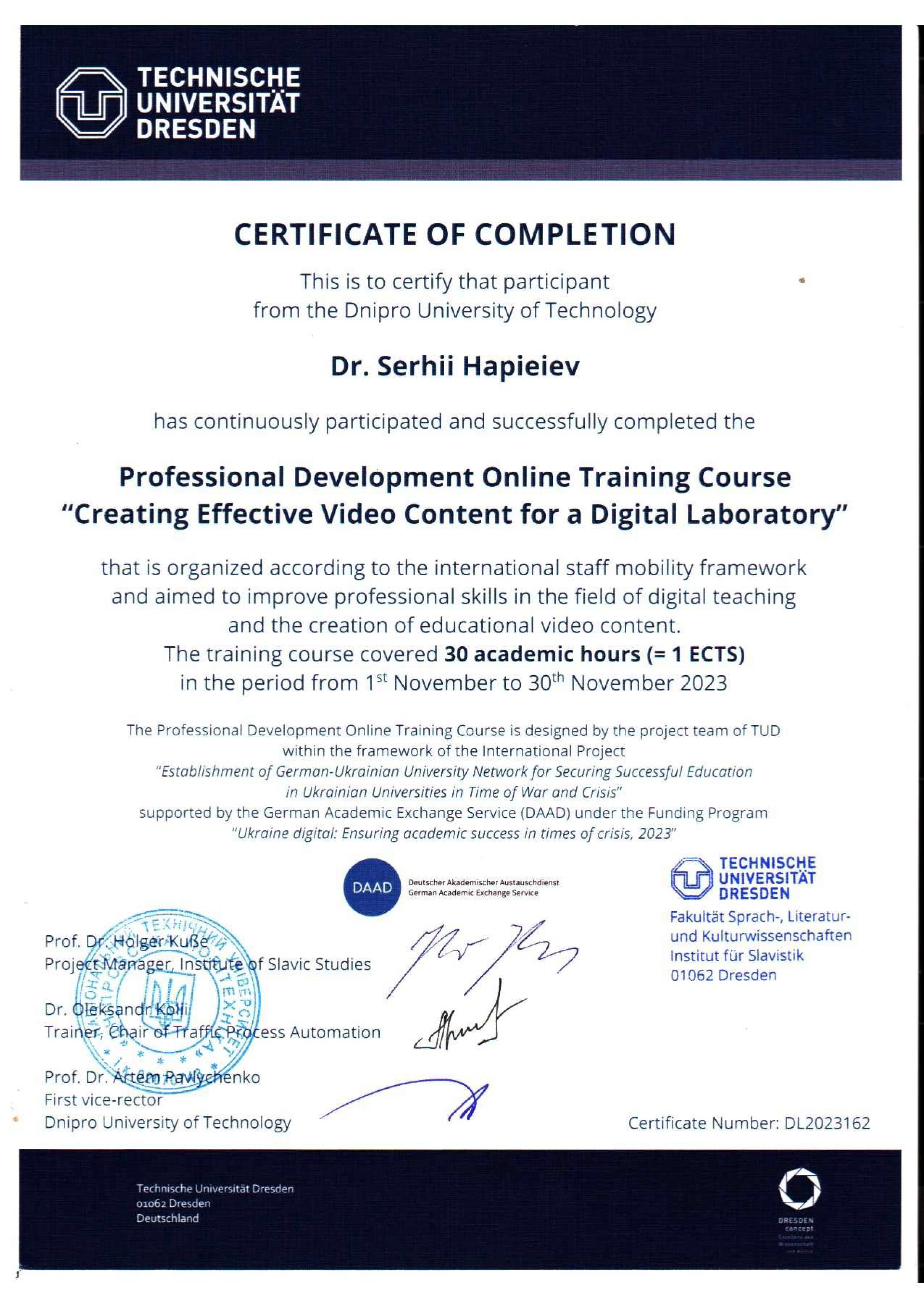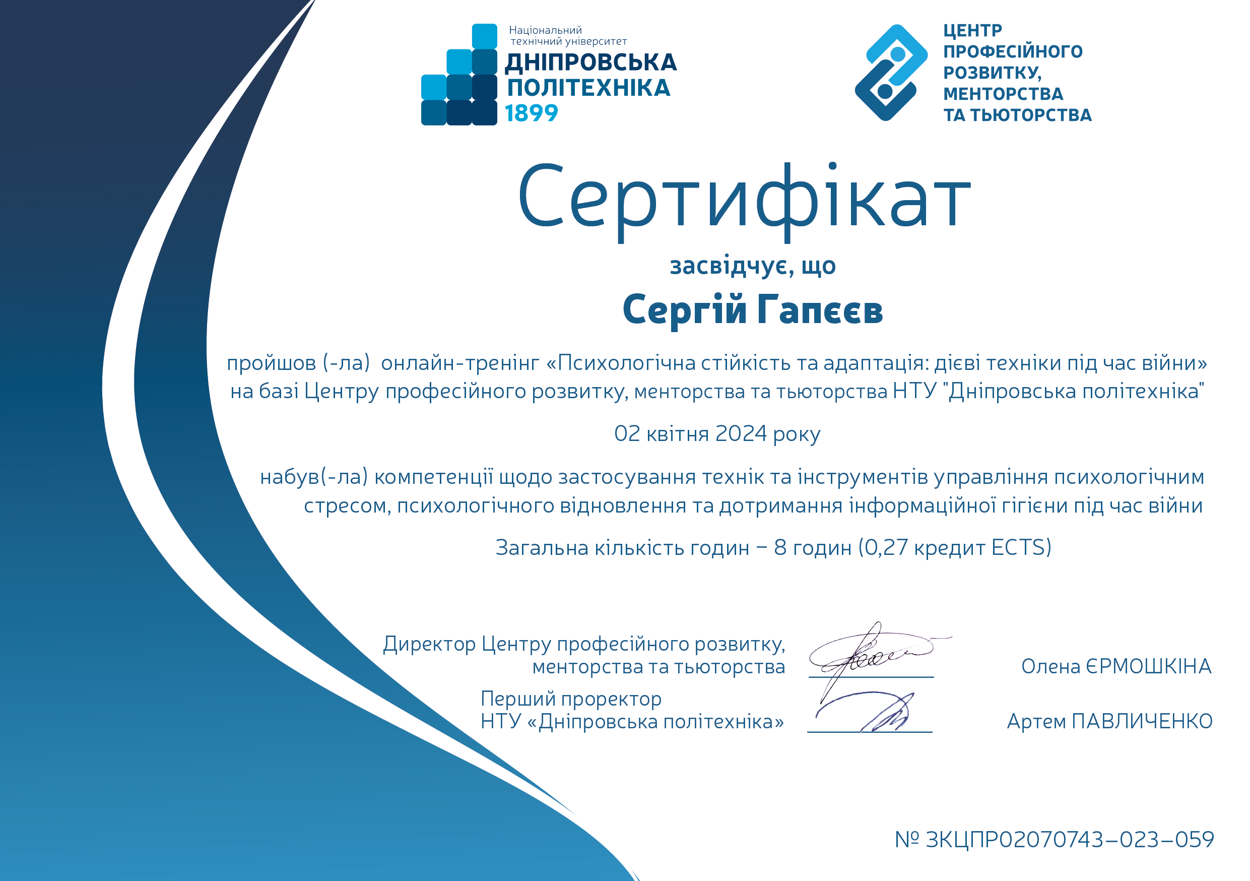 В грудні 2015 року захістив докторську дисертацію за спеціальністю 05.15.09 - Геотехнічна і гірнича механіка. Науковий консультант - професор О.М. Шашенко.