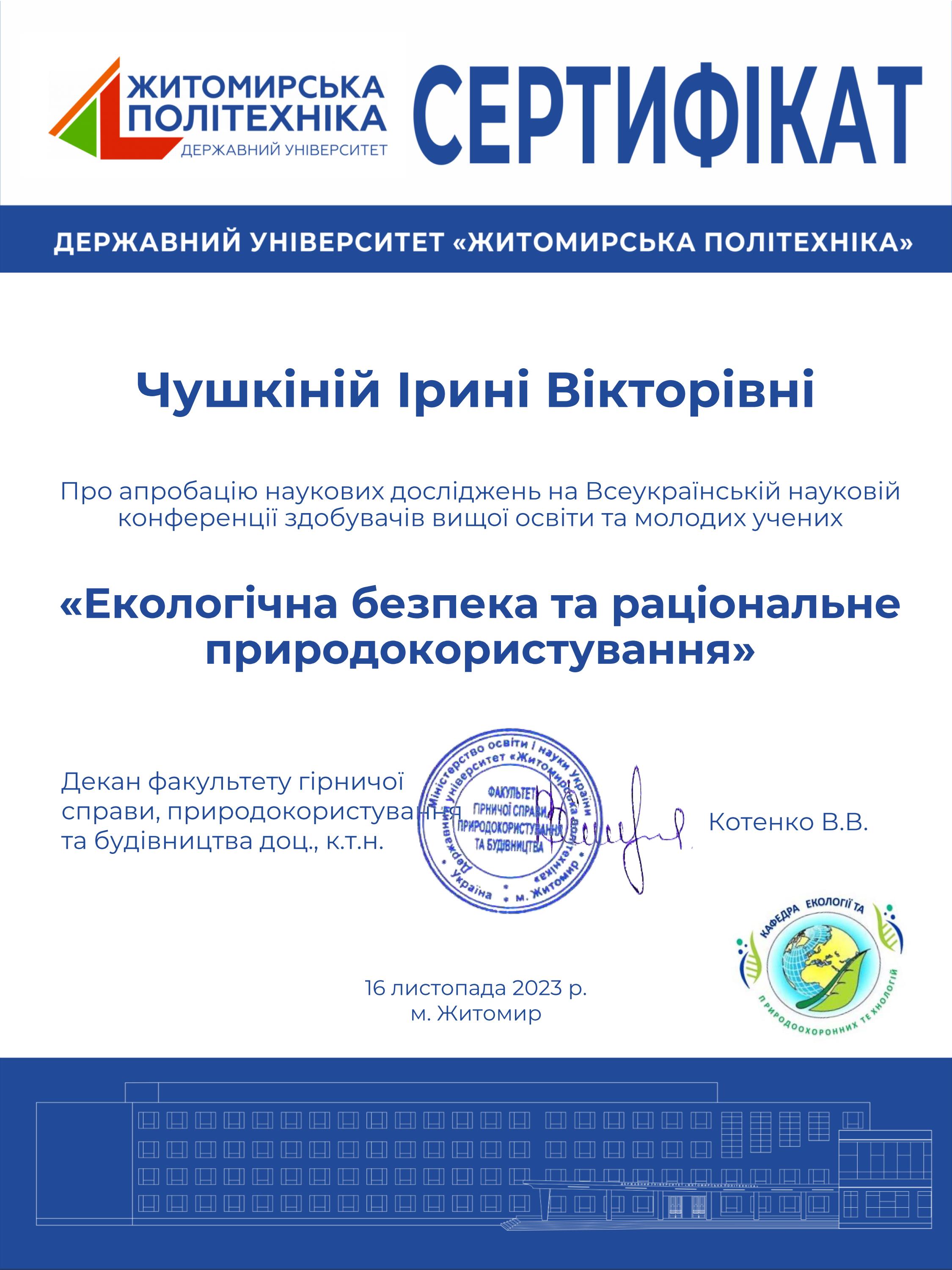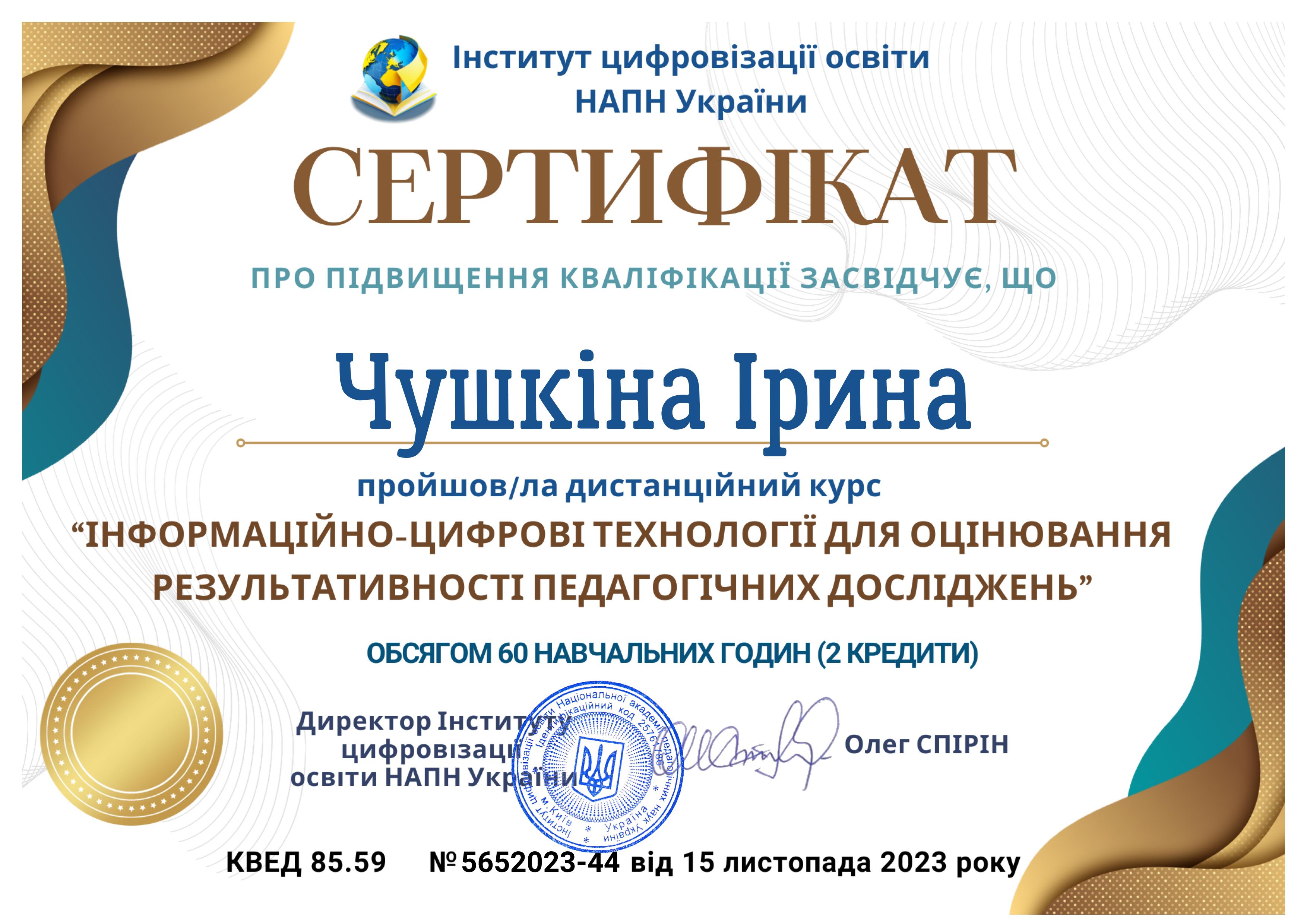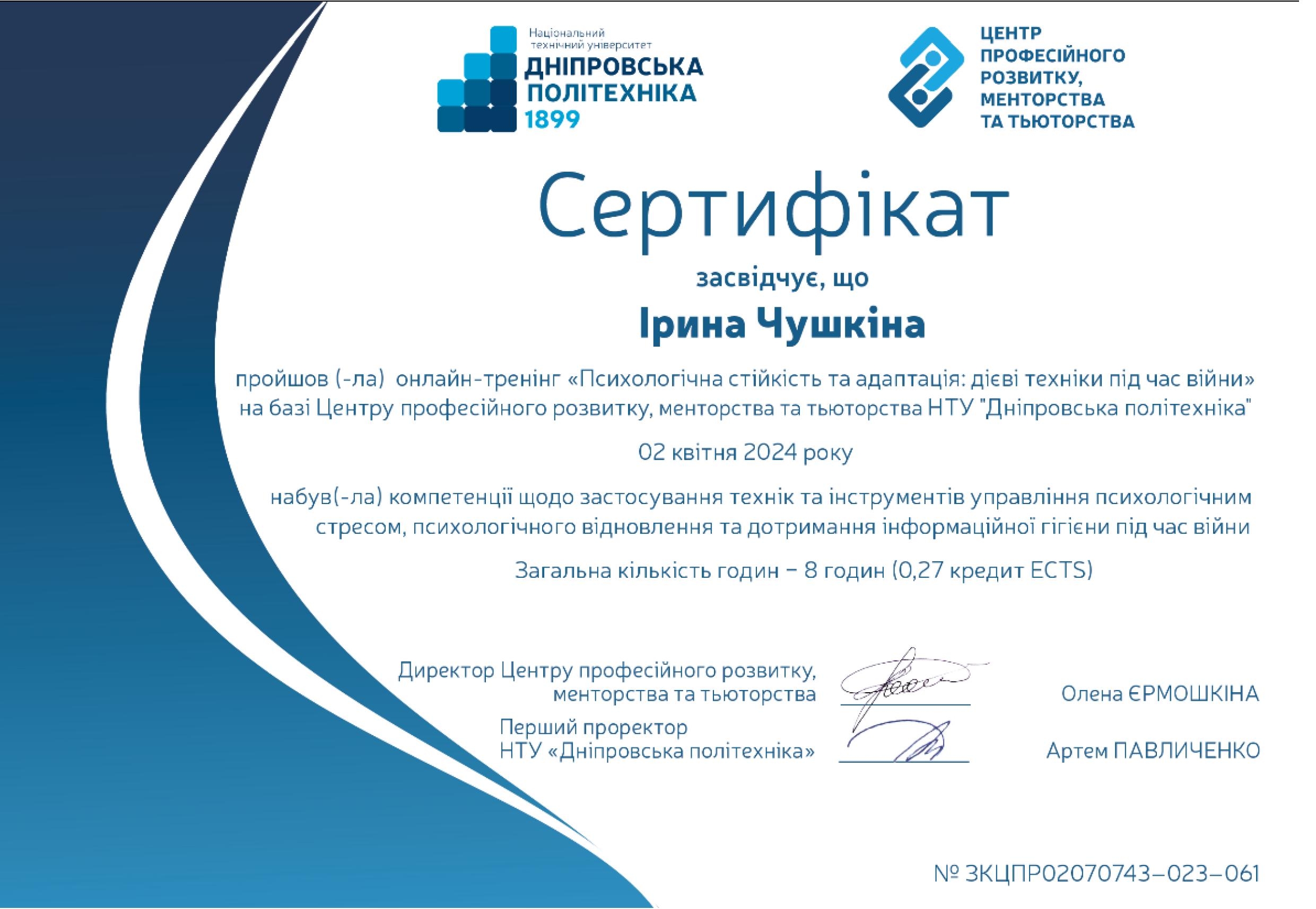- Тренінг «Особливості функціонування культури академічної доброчесності в умовах військового стану» (березень 2023 р.) Сертифікат № ЗКЦПР02070743-012-096. (15 годин).
