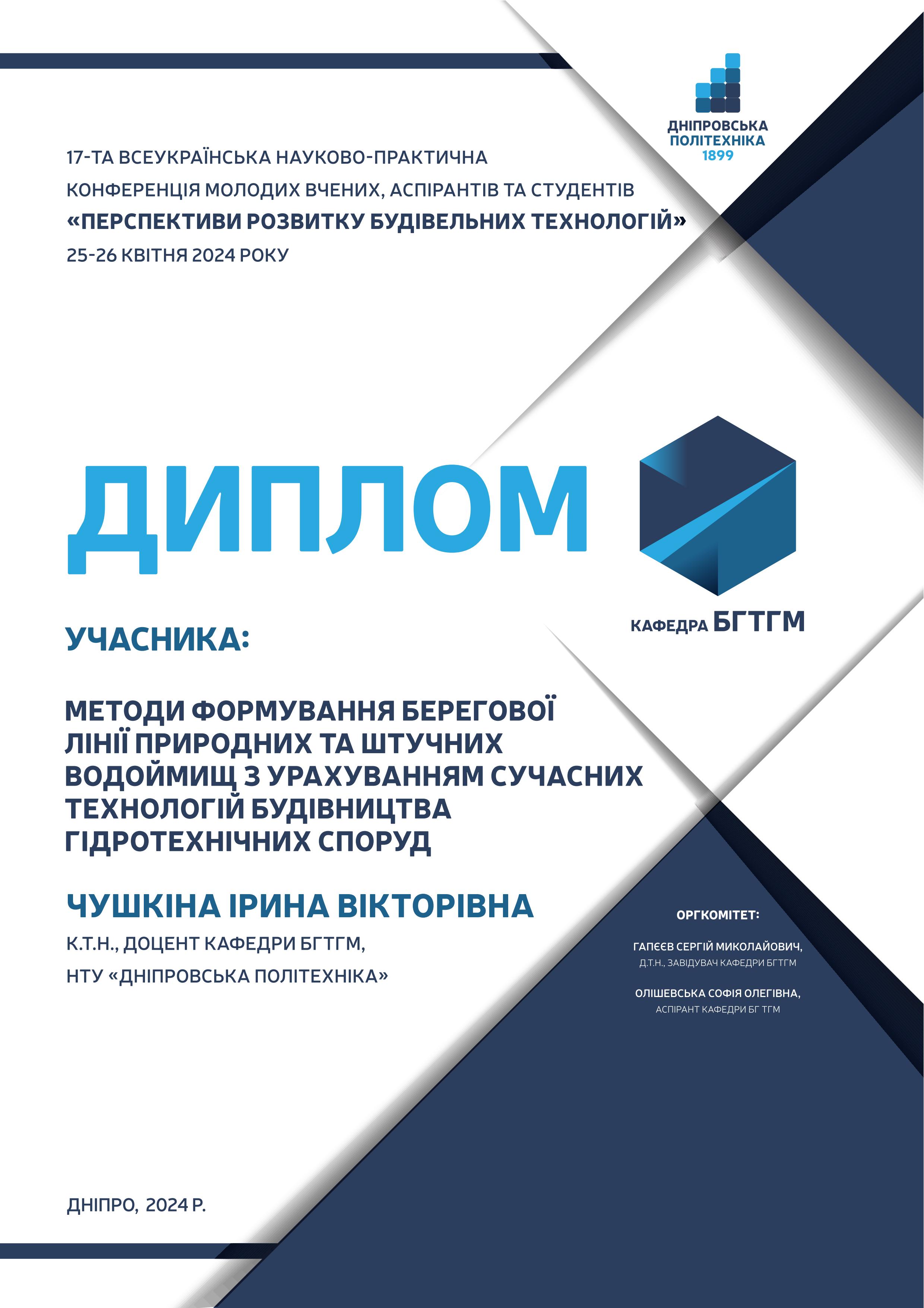Чушкіна І.В., Швець Д.Є. Будівництво гідротехнічних споруд на річці Дніпро: масиви-гіганти та інженерні рішення. Перспективи розвитку будівельних технологій. Матеріали 18-ої всеукраїнської науково-практичної конференції молодих вчених, аспірантів і студентів, 2 травня 2025 р. Д.: НТУ «Дніпровська політехніка», 2025. С.9-11.