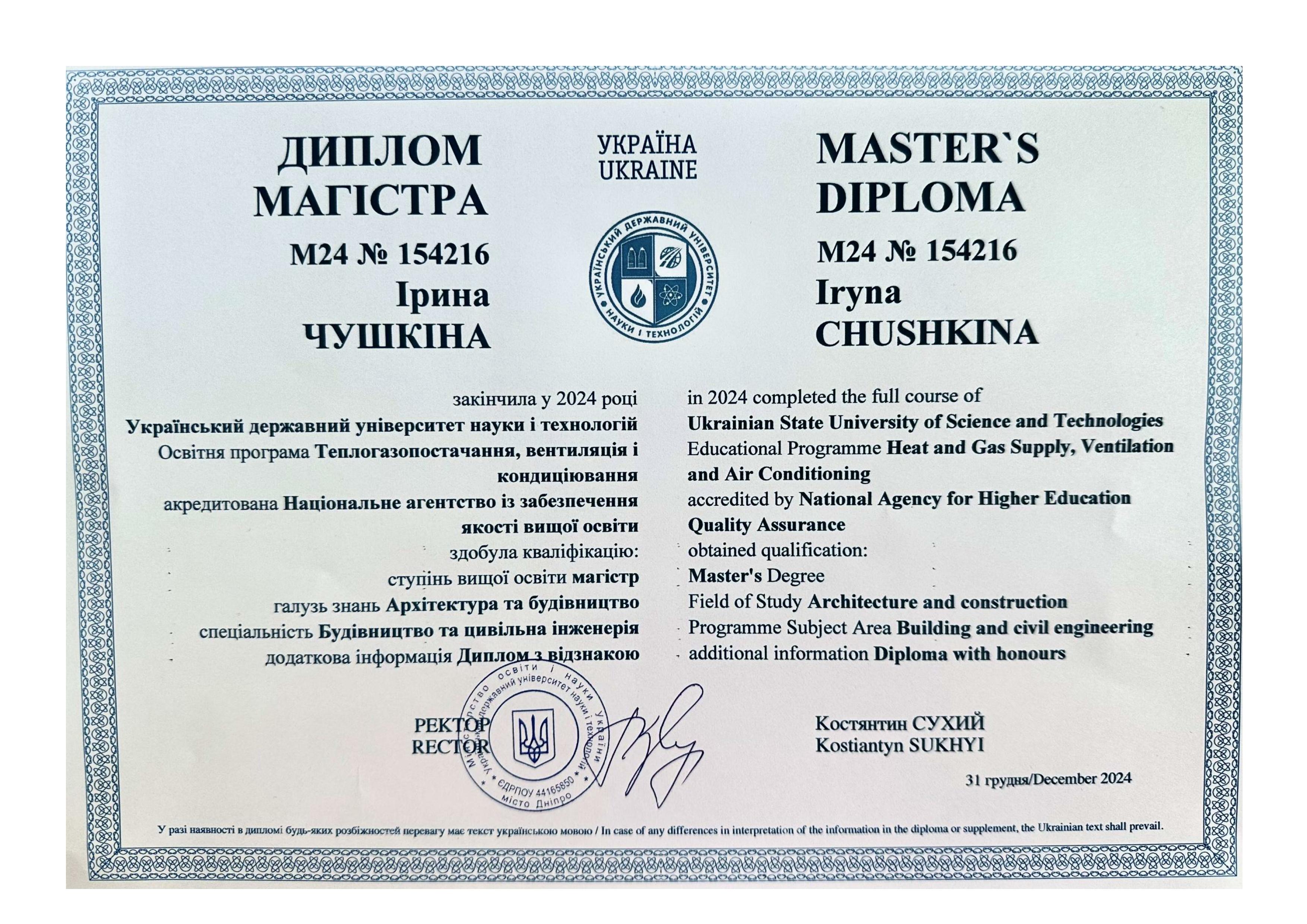 - Отримала вищу освіту за спеціальністю "Будівництво та цивільна інженерія", диплом магістра з відзнакою ОПП “Теплогазопостачання, вентиляція та кондеціонування”, М24 №154216 від 31.12.2024 р.