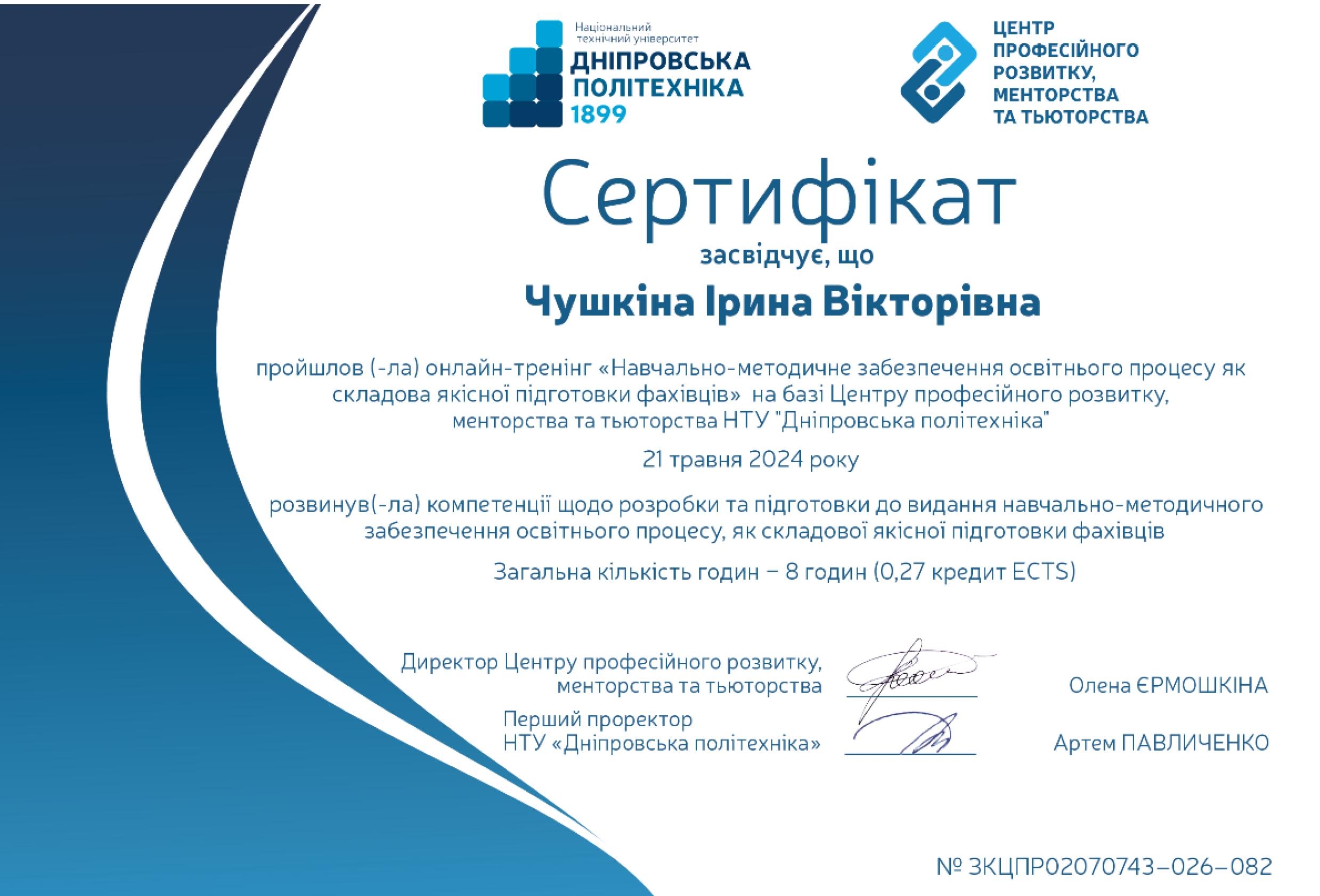- Підвищення кваліфікації в НТУ ДП № 1/23-842 від 01.07.2021 р. (травень-червоний 2021 р.) (120 год.).