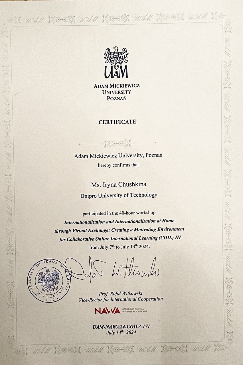 - Стажування в університеті імені Адама Міцкевича в міжнародній літній школі „Internationalization and Internationalization at Home through Virtual Exchange: Creating a Motivating Environment for Collaborative Online International Learning (COIL)” в рамках проекту «BNI-UE-2023-23: Співпраця Університету Адама Міцкевича з університетами України в рамках альянсу Європейських університетів», 07-13.07.2024р. Сертифікат № UAM-NAWA24-COIL3-171 (40 год).