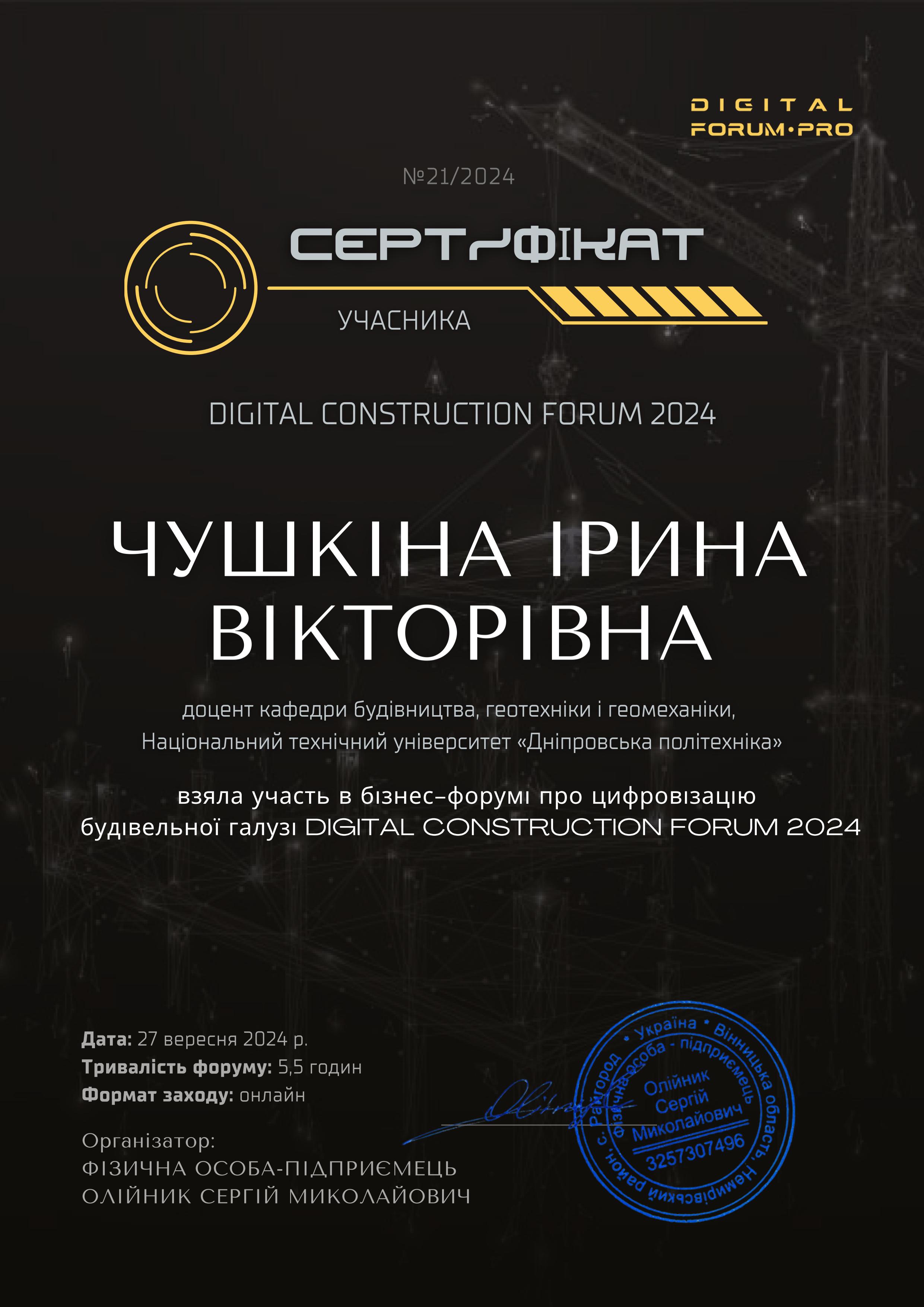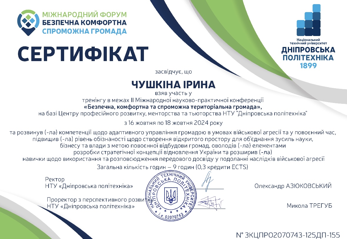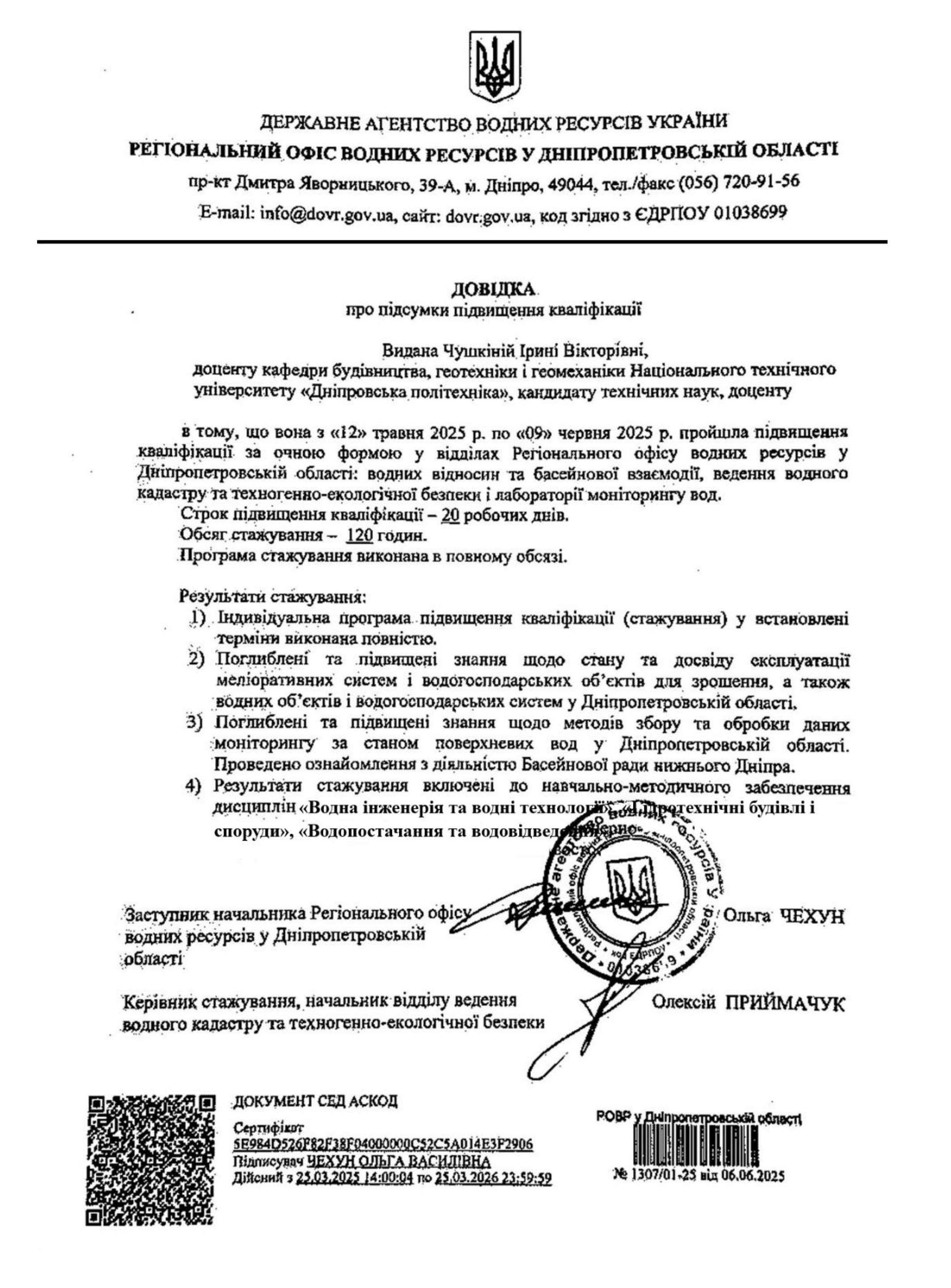 - Пройшла підвищення кваліфікації в Регіональному офісі водних ресурсів Дніпропетровської області з 12.05 по 09.06.2025р., обсяг 120 академічних годин.