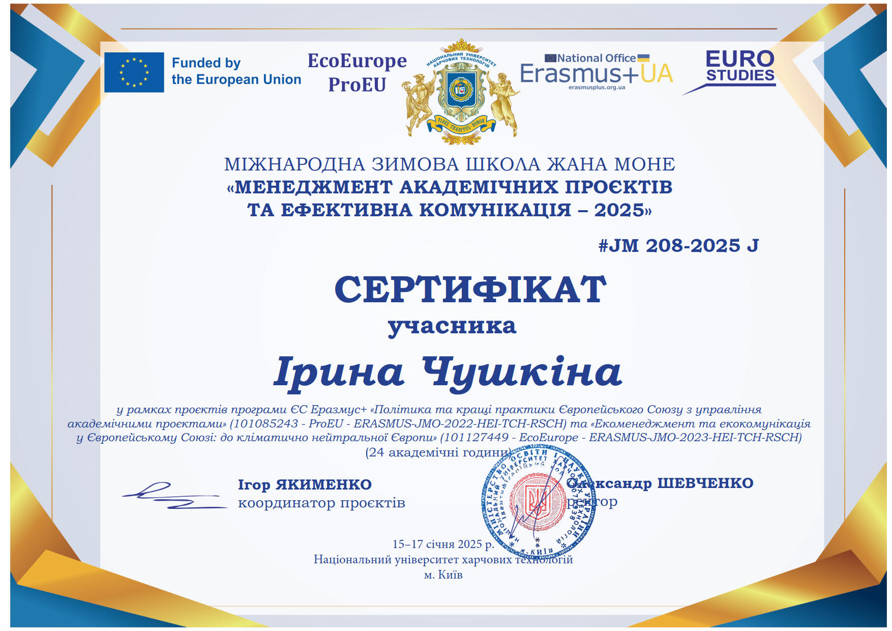 - У рамках проєктів програми ЄС Еразмус+ «Політика та кращі практики Європейського Союзу з управління академічними проєктами (101085243 – Pro EU – ERASMUS-JMO-2022-HEI-TCH-RSCH) та «Екоменджмент та екокомунікація у європейському Союзі: до кліматично нейтральної Європи». Участь у Міжнародній зимовій школи Жана Моне «Менеджмент академічних проєктів та ефективна комунікація – 2025», 15-17 січня 2025р., Національний університет харчових технологій. м. Київ. Сертифікат №#JM 208-2025 J. (24 год.).