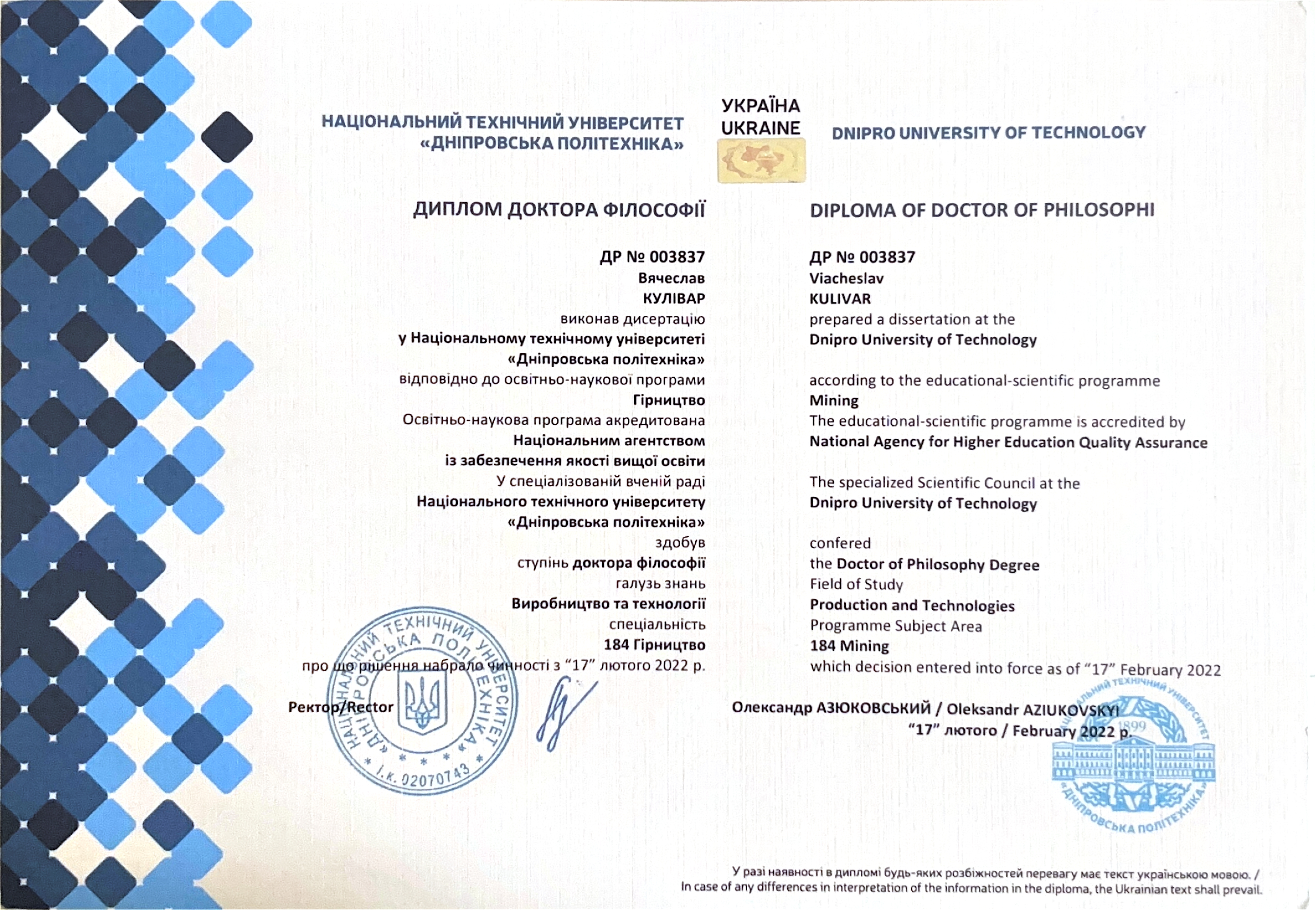 Doctor of Philosophy (184 Гірництво)