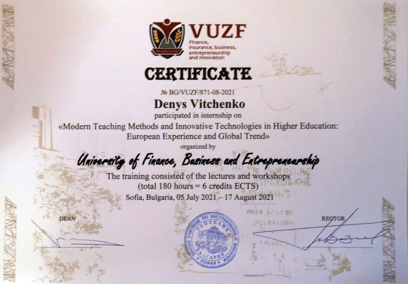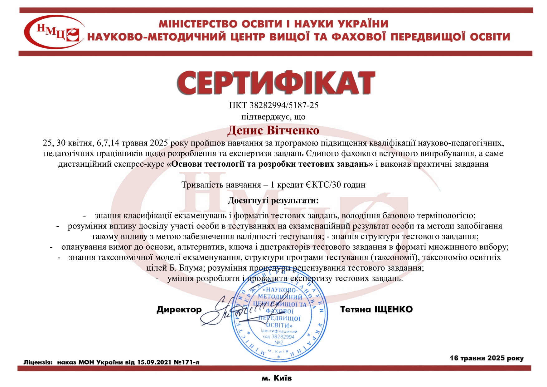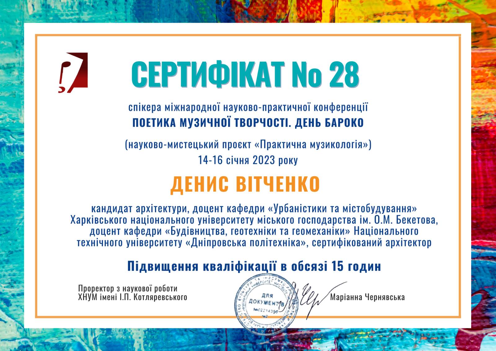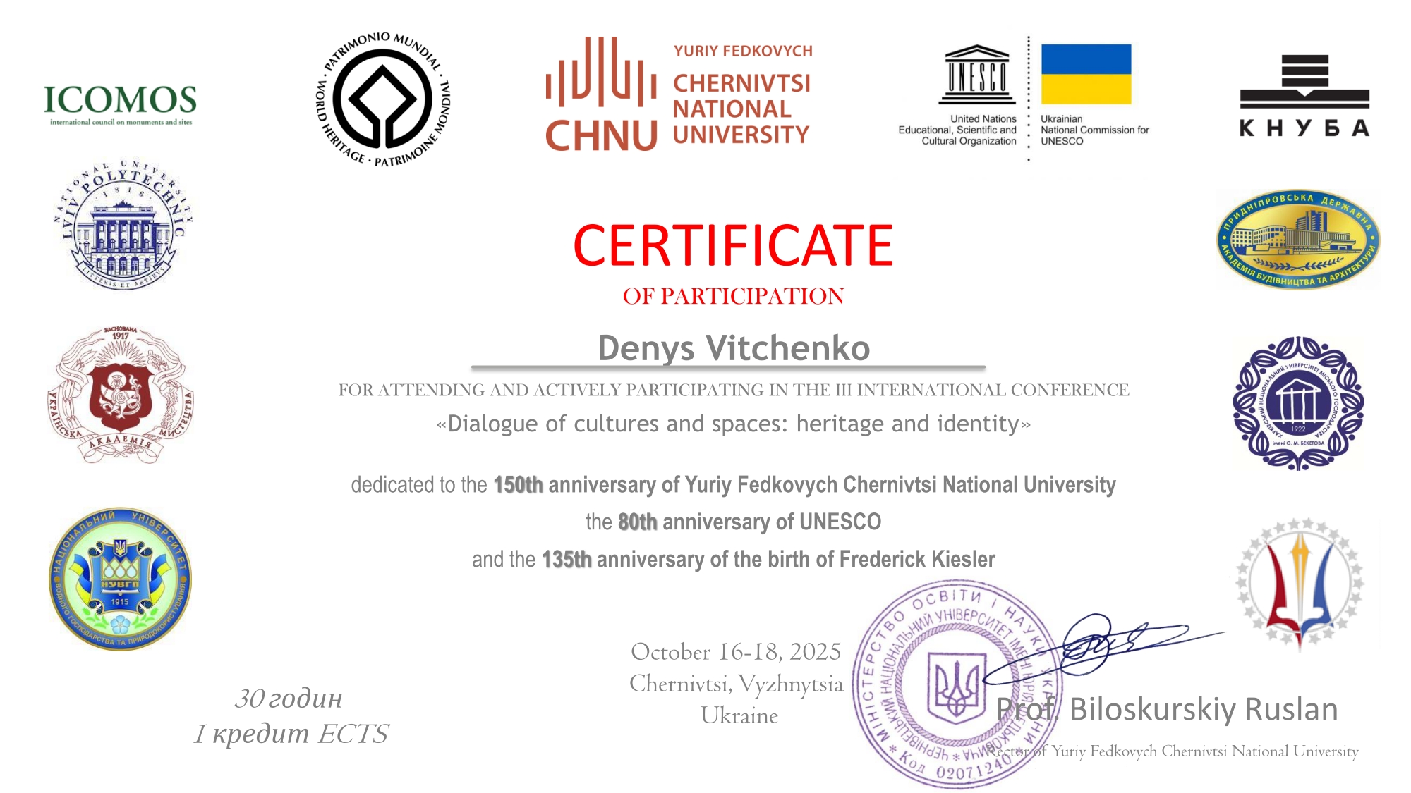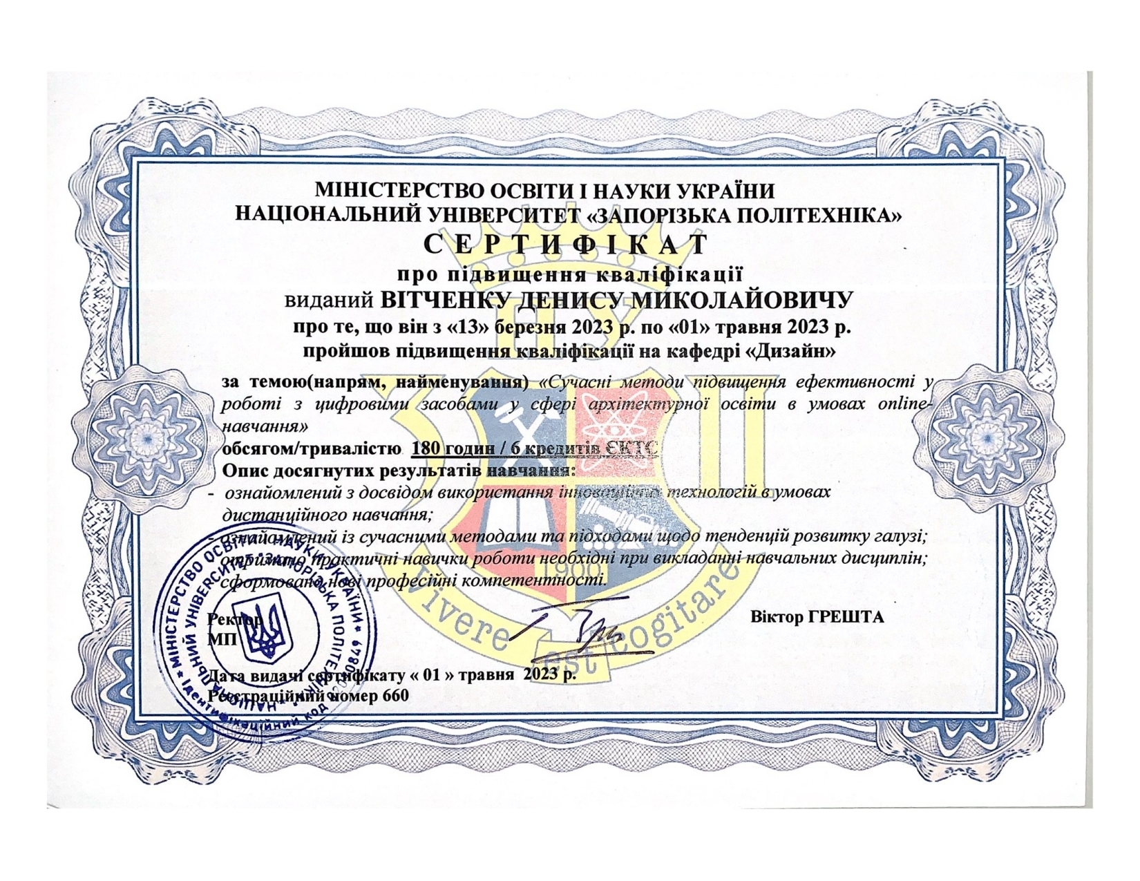 Денис Вітченко – науковий керівник НДР № 0121U110018 «Історико-архітектурний опорний план м. Краматорська з визначенням меж і режимів використання історичного ареалу та зон охорони пам’яток» у ХНУМГ імені О.М. Бекетова (2023-2024 рр.).