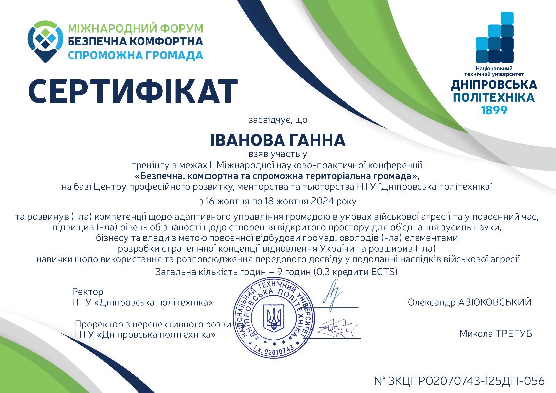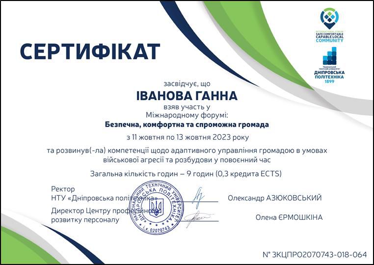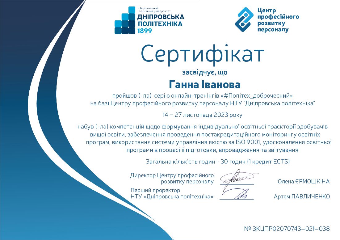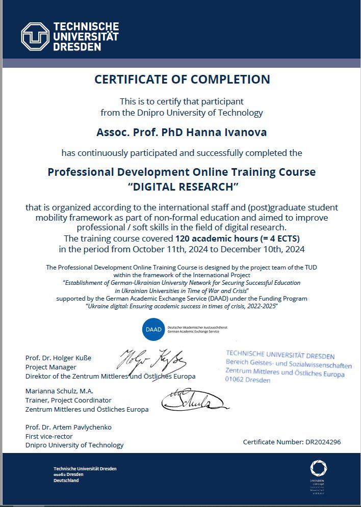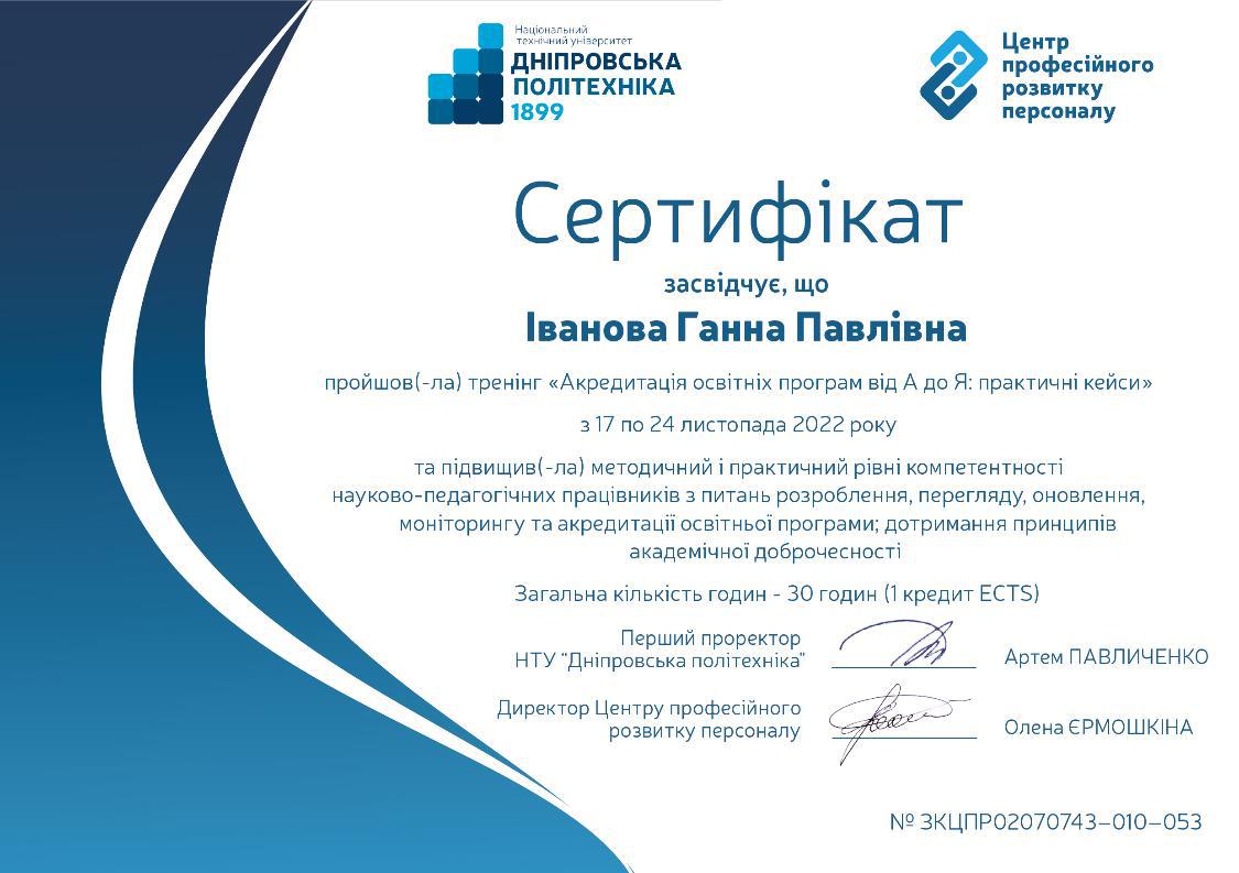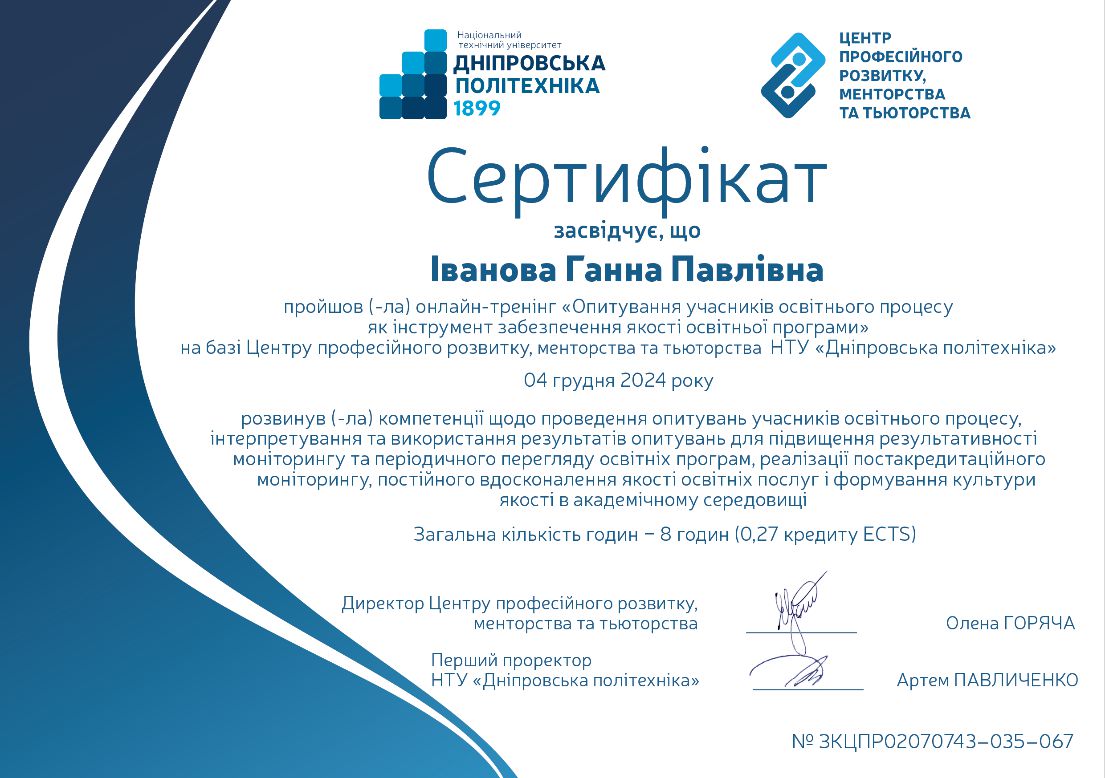 Брала участь у тренінгу (тренер Ус С.А. професор кафедри системного аналізу і управління НТУ «Дніпровська політехніка») для підготовки експертів із забезпечення якості вищої освіти, який проходив 29 березня 2019 року у Національному технічному університеті «Дніпровська політехніка». Отримала сертифікат.