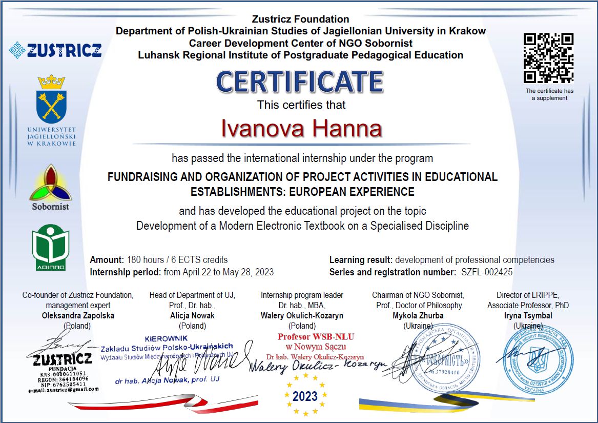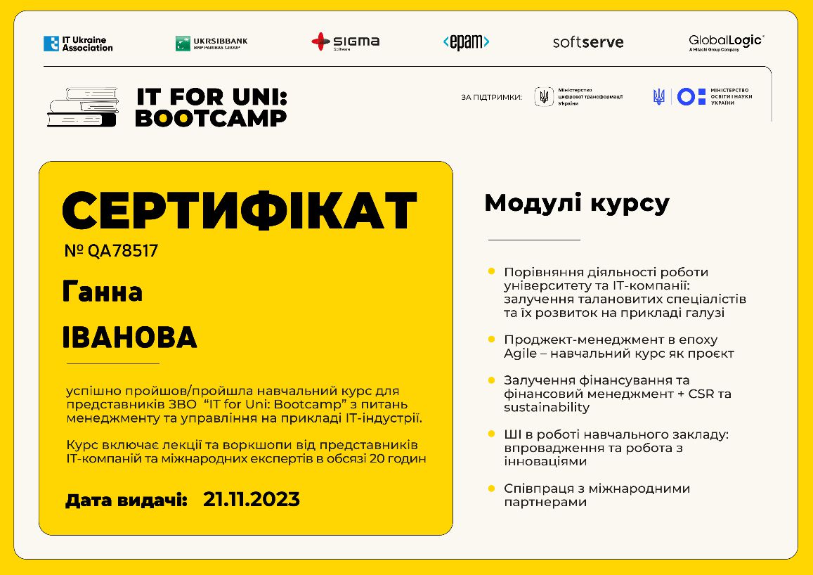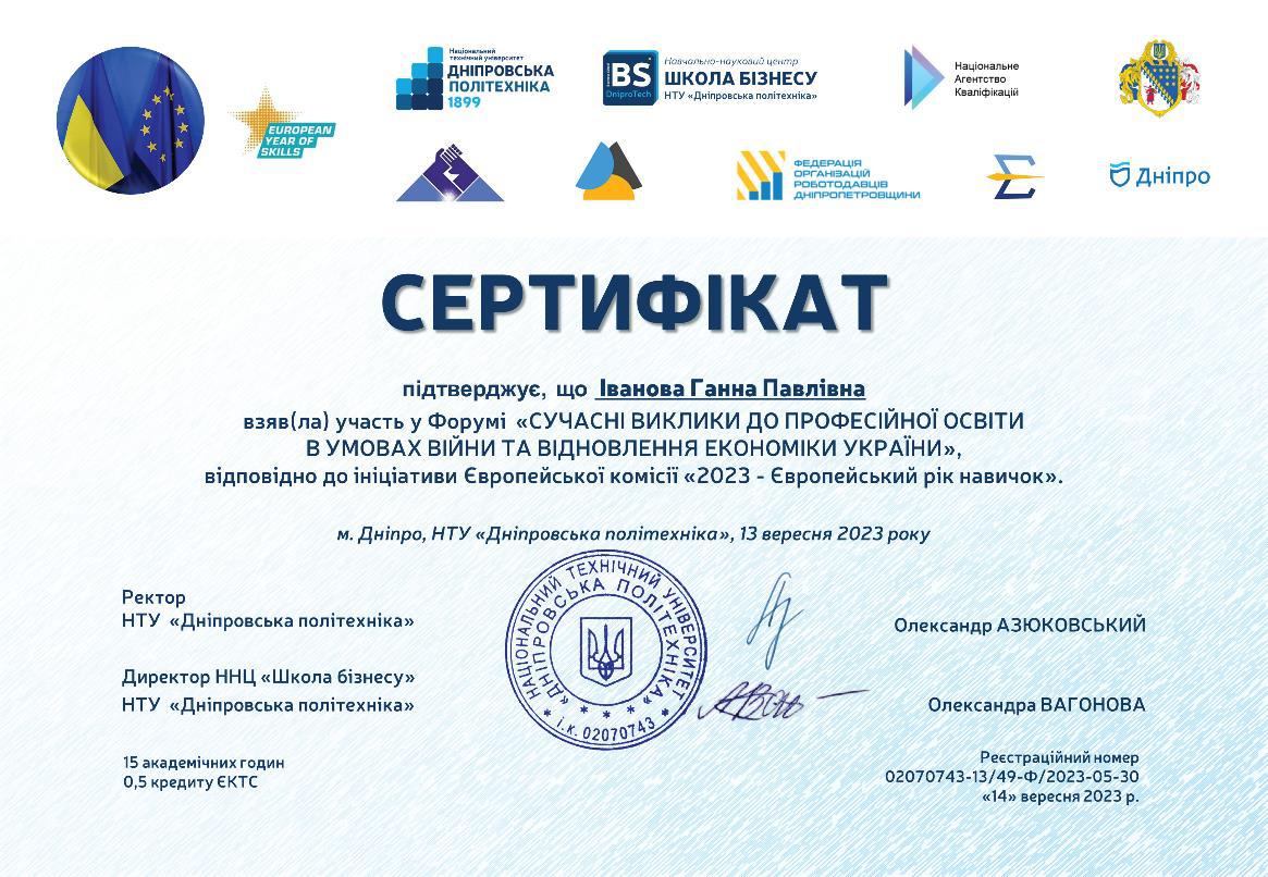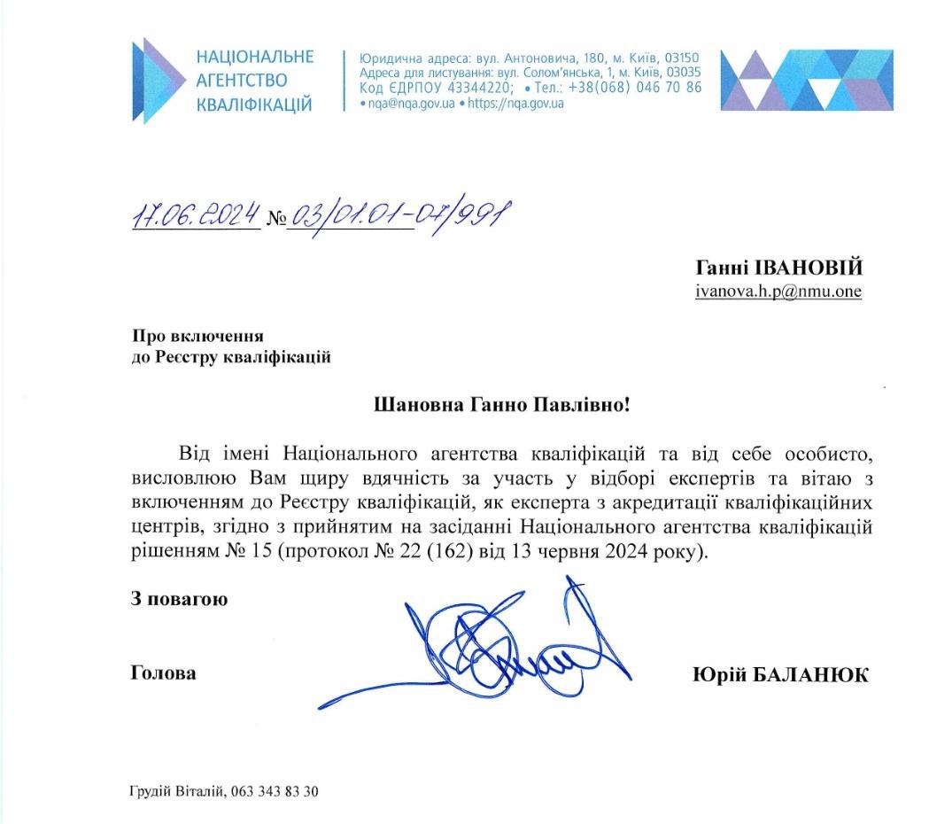 Брала участь у тренінгу (тренер Ус С.А. професор кафедри системного аналізу і управління НТУ «Дніпровська політехніка») для підготовки експертів із забезпечення якості вищої освіти, який проходив 29 березня 2019 року у Національному технічному університеті «Дніпровська політехніка». Отримала сертифікат.
