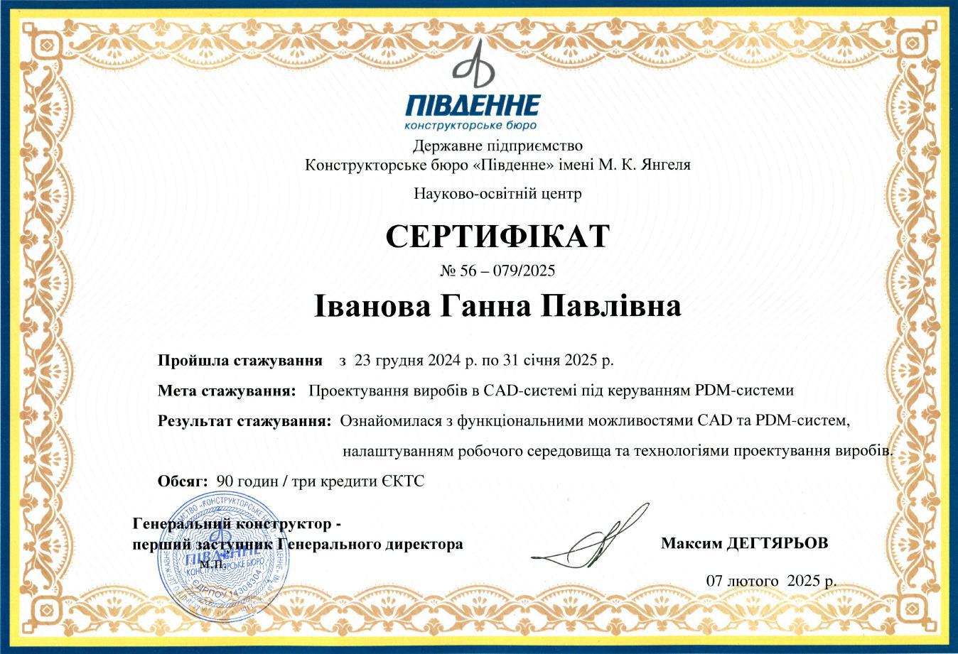 З 26.12.2016 – 26.01.2017 підвищувала кваліфікацію у Дніпропетровському національному університеті залізничного транспорту им. Акад. В. Лазаряна. Тема стажування: «Опанування методами чисельного моделювання поведінки багатоелементних конструкцій із начальними або набутими у процесі експлуатації дефектами, в умовах впливу динамічних навантажень з використанням сучасних програмних комплексів».