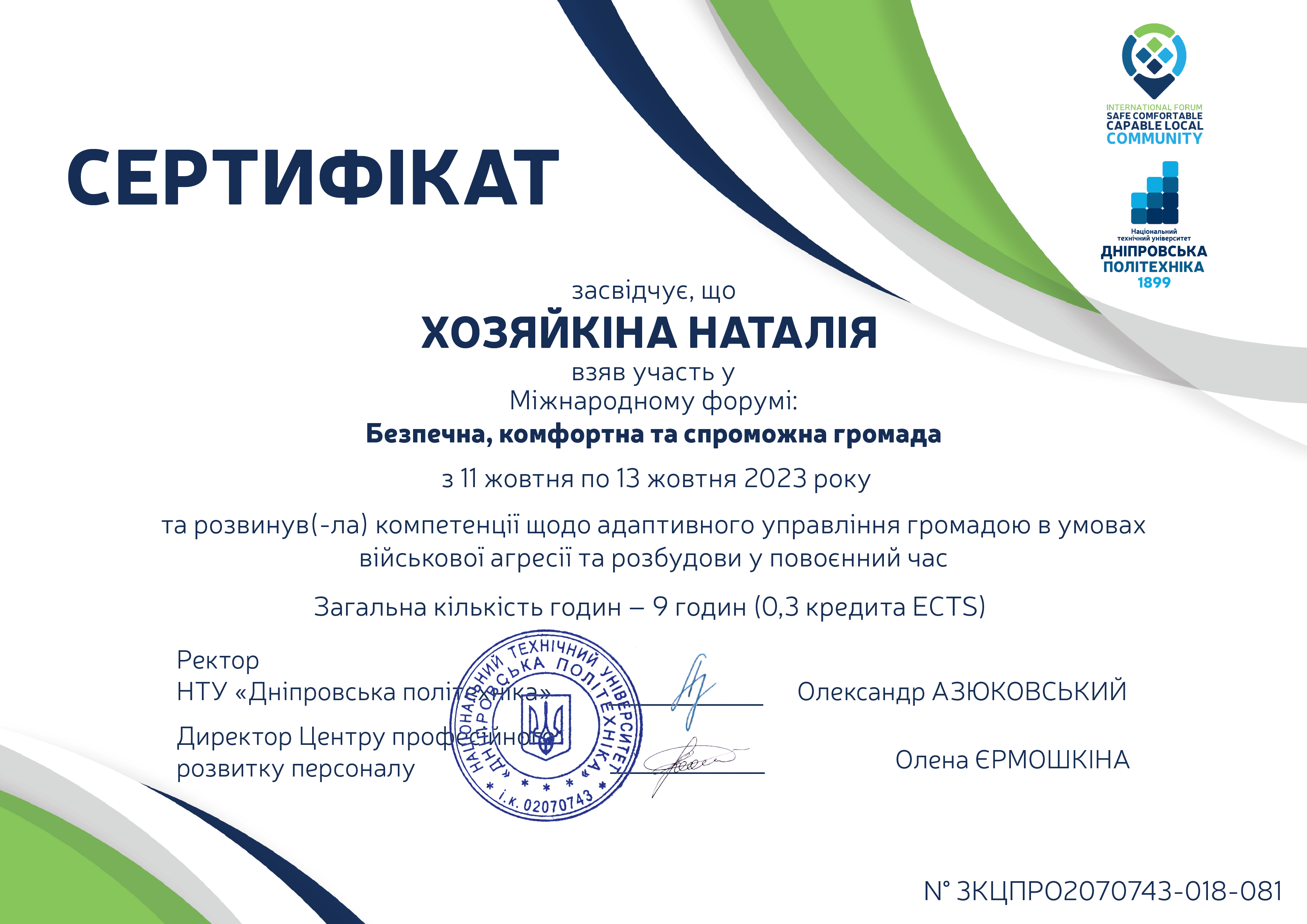 У 2023 році здобула другу вищу освіту за спеціальністю «Будівництво та цивільна інженерія», отримала диплом магістра з відзнакою Національного технічного університету "Дніпровська політехніка".