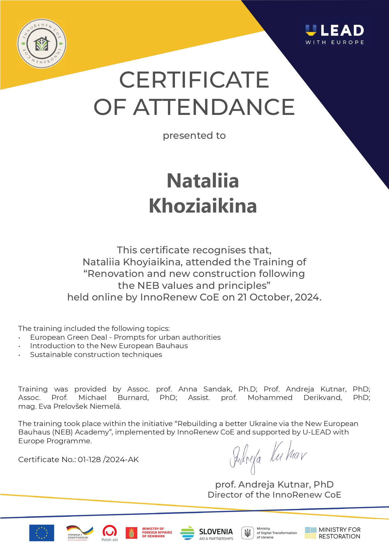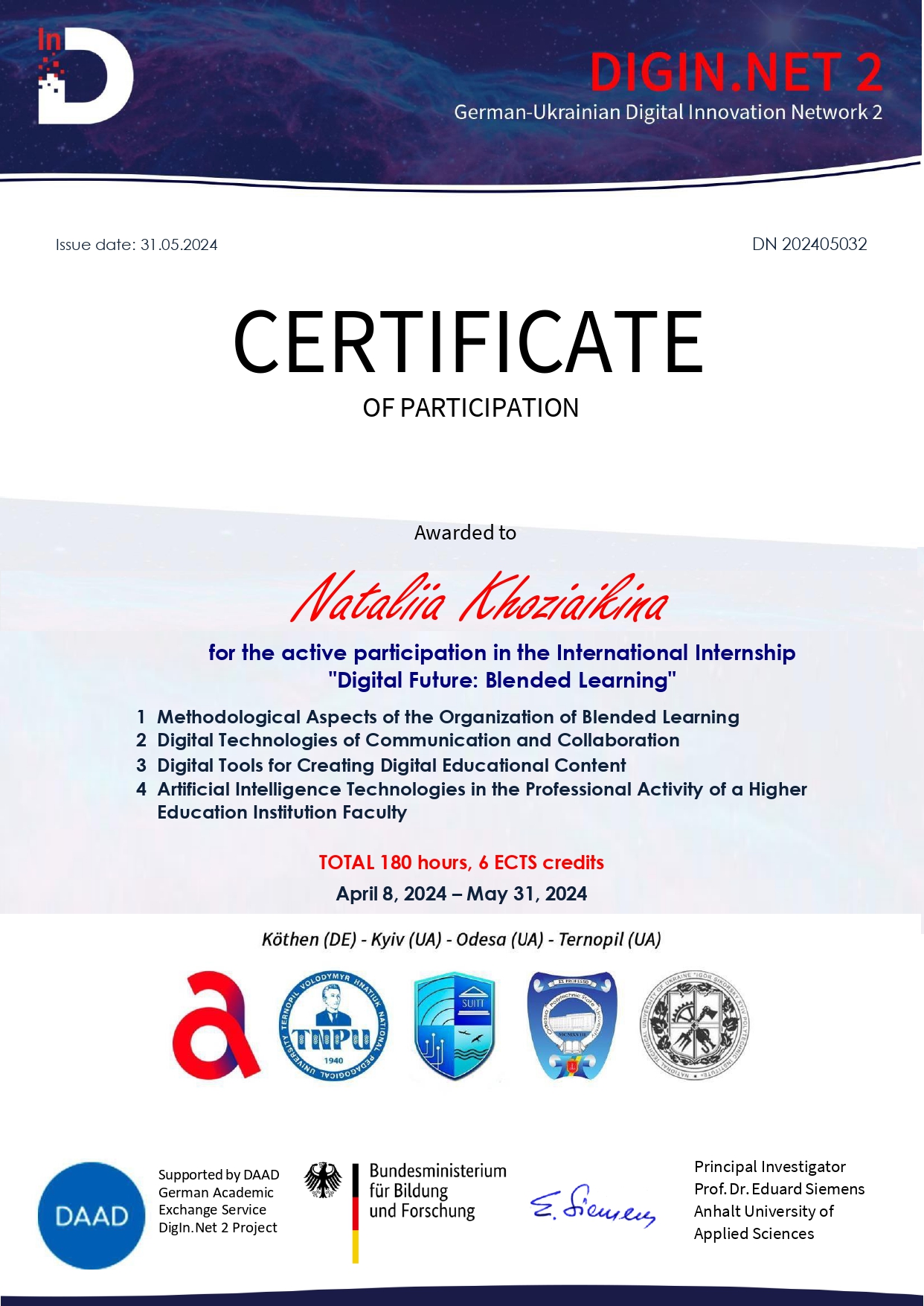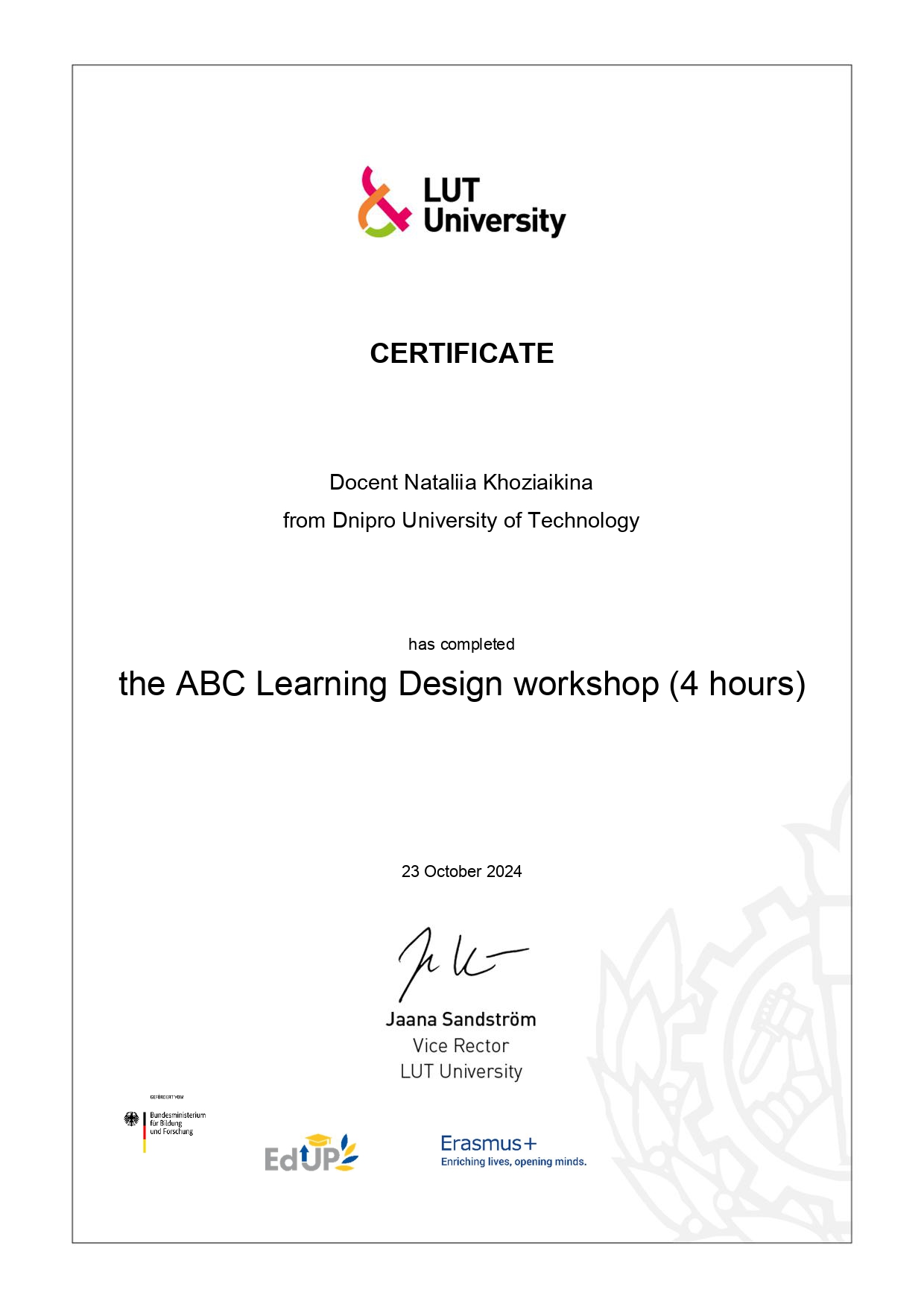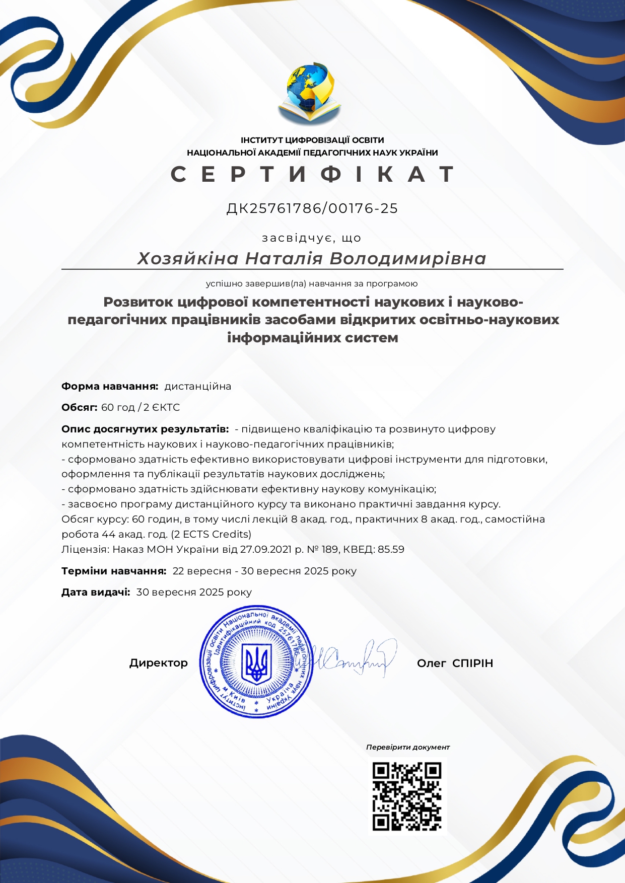 У 2005 році отримала міжнародний додаток до диплома (Diploma Supplement) з присвоєнням ступеня Doctor of Philosophy (PhD) у галузі технічних наук (soil and rock mechanics).